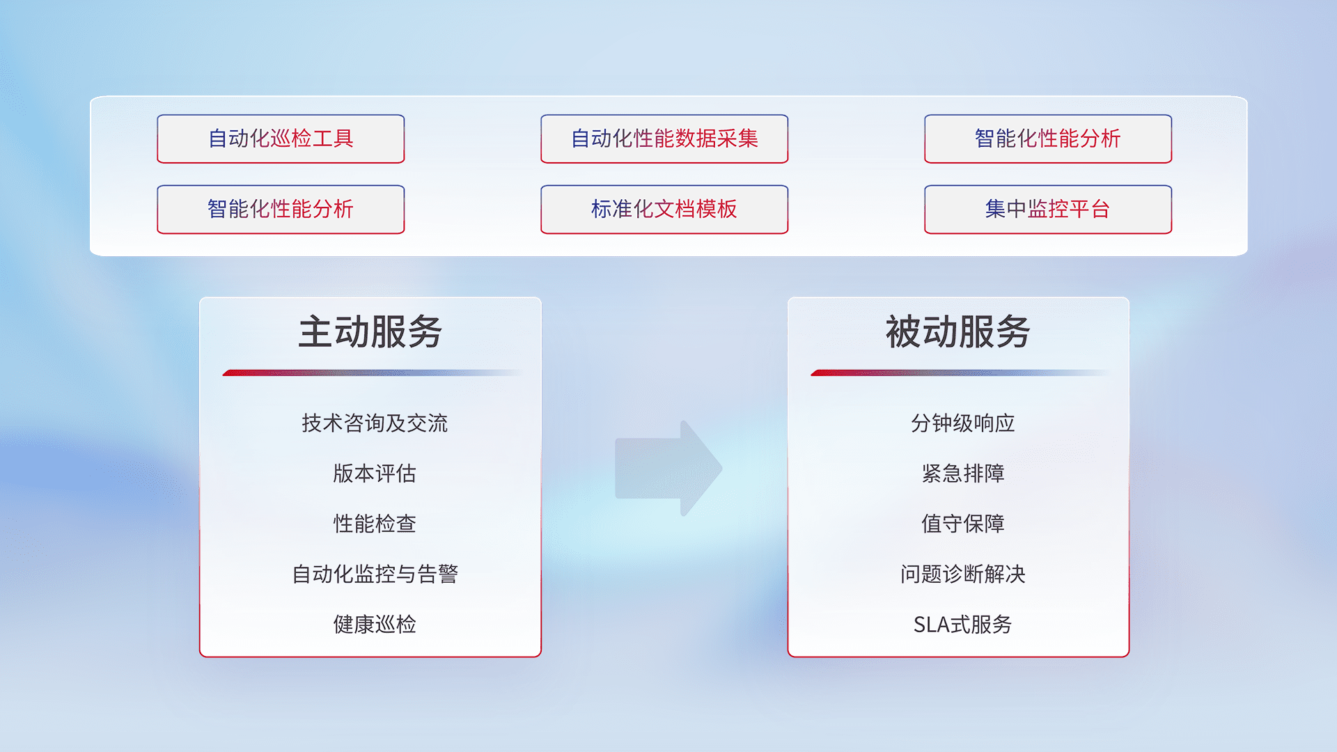 智能化工具和标准化文档,,,保障服务质量,,,,提供主动服务(包含技术咨询、、版本评估、、、性能检查、、、自动化监控与告警、、、健康巡检)和被动服务包含(分钟级响应、、、、紧急排障、、、值守保障、、、、问题诊断解决、、、、SLA服务)。。。