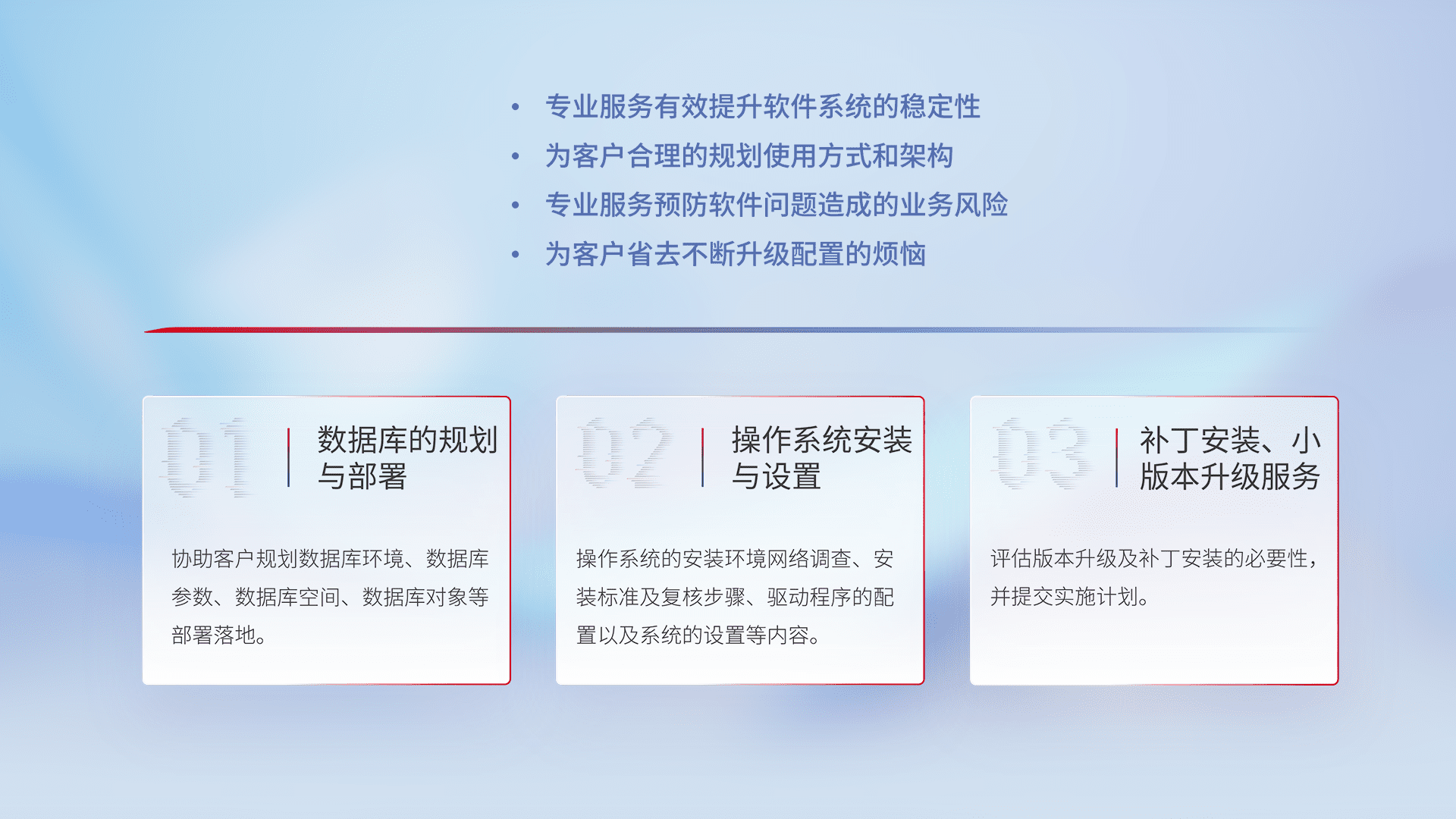 为客户提供软件规模升级、、、快速部署、、、、按需配置的专业服务,,,,从数据库的规划与部署到操作系统的安装与设置,,再到补丁安装和小版本升级提供支持。。